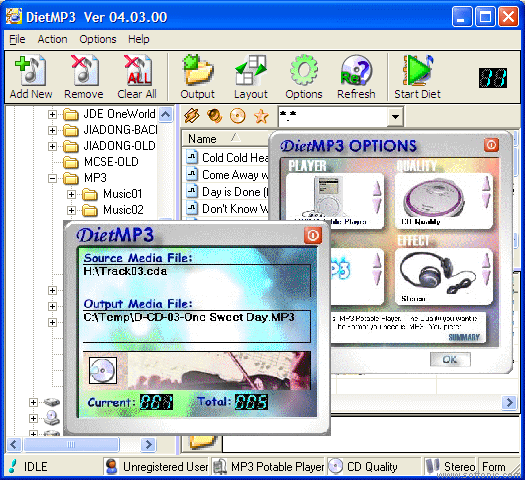 Программа для сжатия файлов MP3 (может сжимать, оставляя от 70% до 30% от исходного файла, не ухудшая при этом качество звука). Сжатые с помощью DietMP3 файлы MP3 можно прослушивать на мобильном телефоне или флэш-плеерах. Помимо сжатия MP3, утилита может грабить файлы с аудио-дисков и сжимать в MP3 в желаемом качестве.